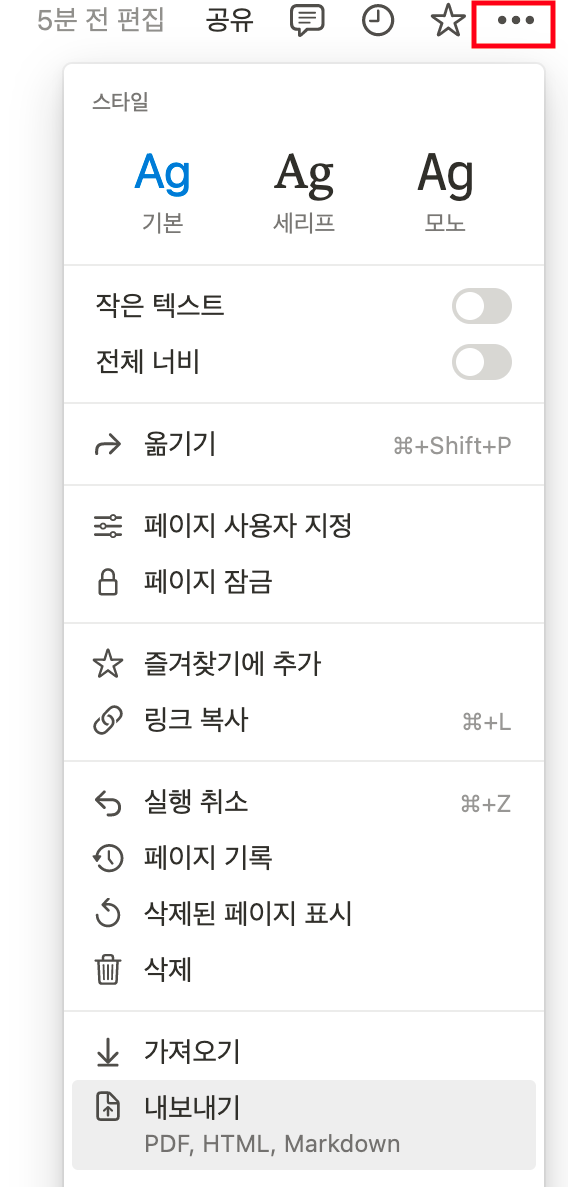 다 작성한 후에는 노션 우측 상단의 더보기 메뉴를 눌러서 내보내기 기능을 이용해 PDF로 저장합니다.