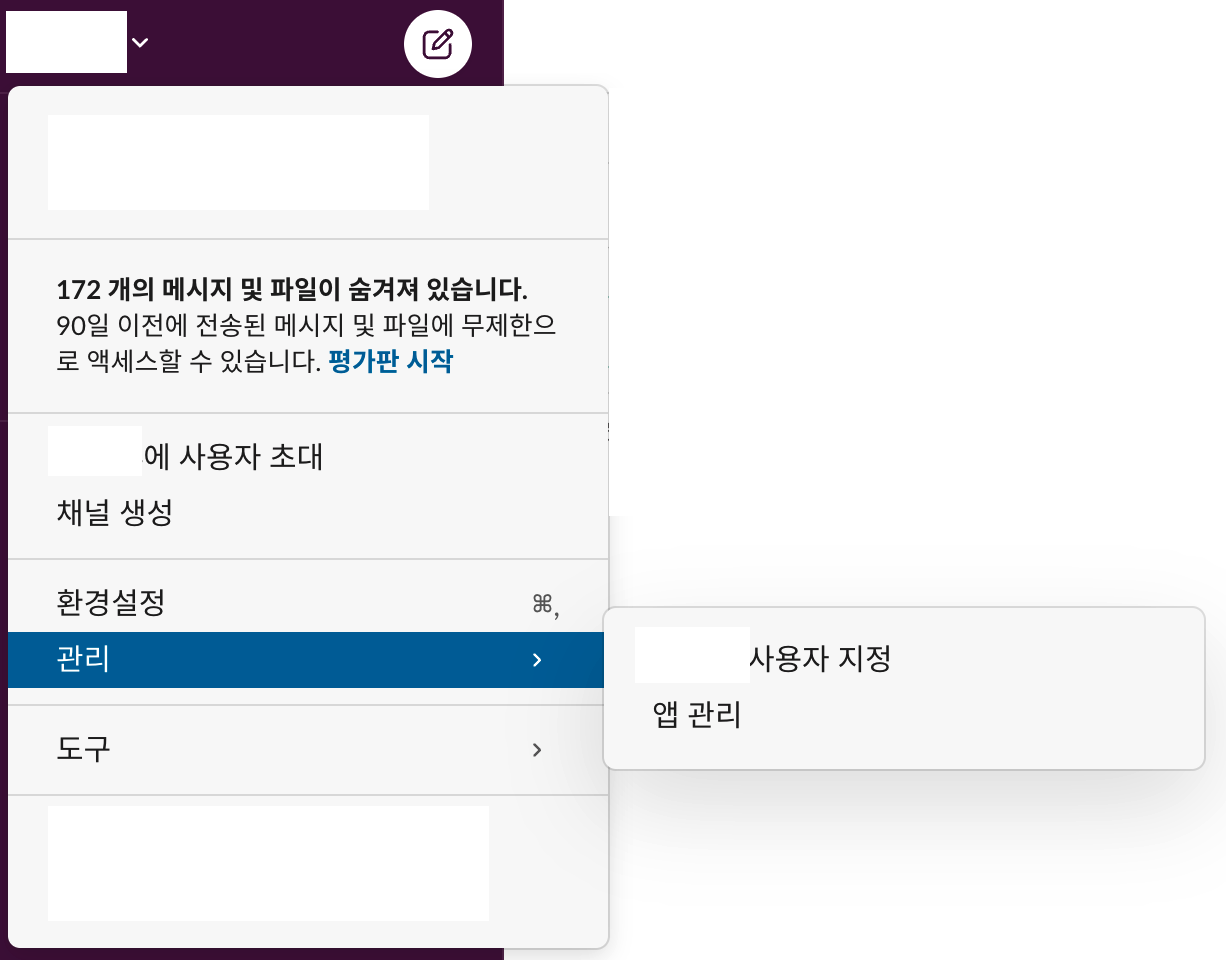 - 왼쪽 상단의 워크스페이스 이름 > 관리 > 앱 관리 선택