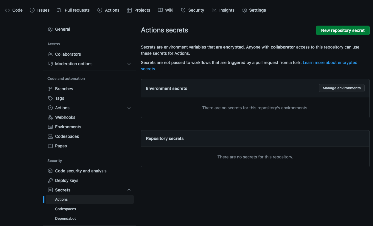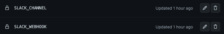 - New repository secret을 눌러서 SLACK_WEBHOOK, SLACK_CHANNEL 정보를 입력