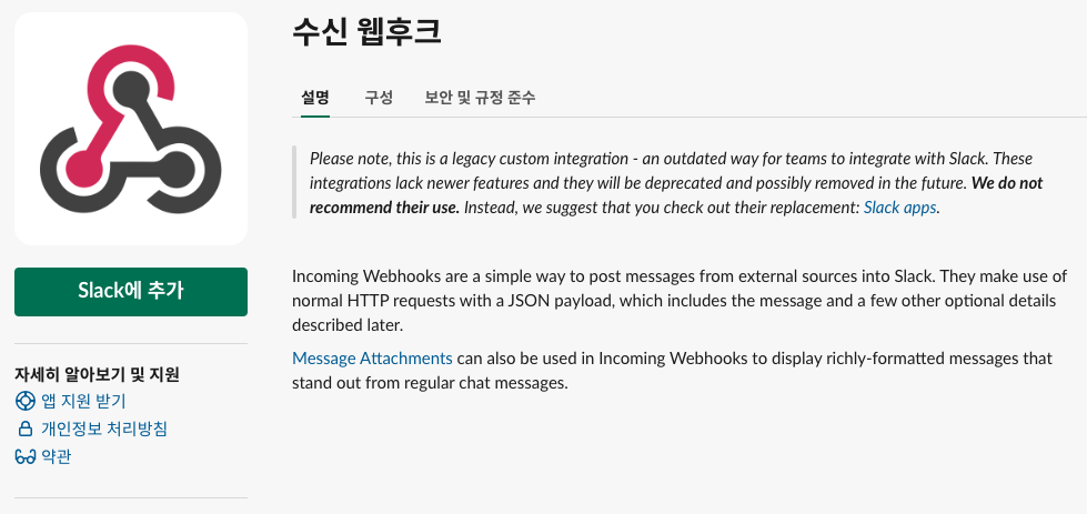 - 앱 추가 완료 후 이동 한 페이지에서 웹후크 URL 확인