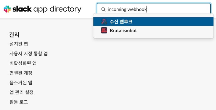- 메세지 수신할 채널 선택 후 수신 웹후크 통합 앱 추가 실행