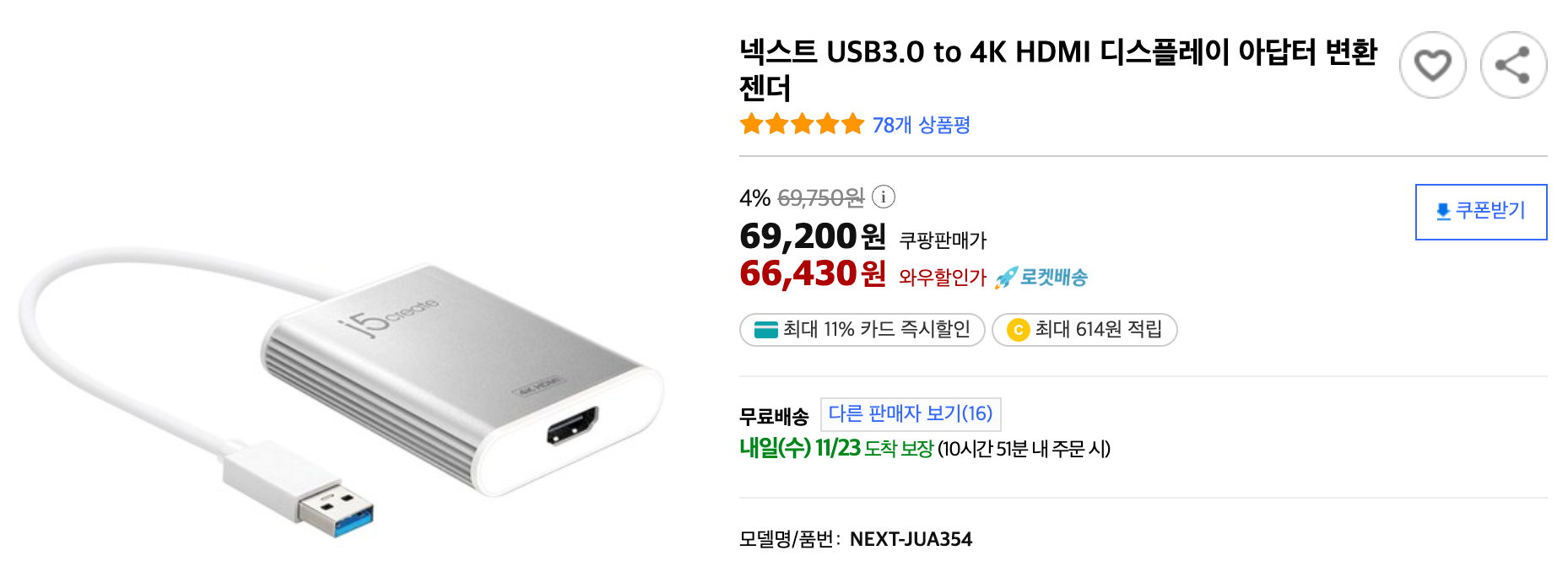 넥스트 USB3.0 to 4K HDMI 디스플레이 아답터 변환젠더