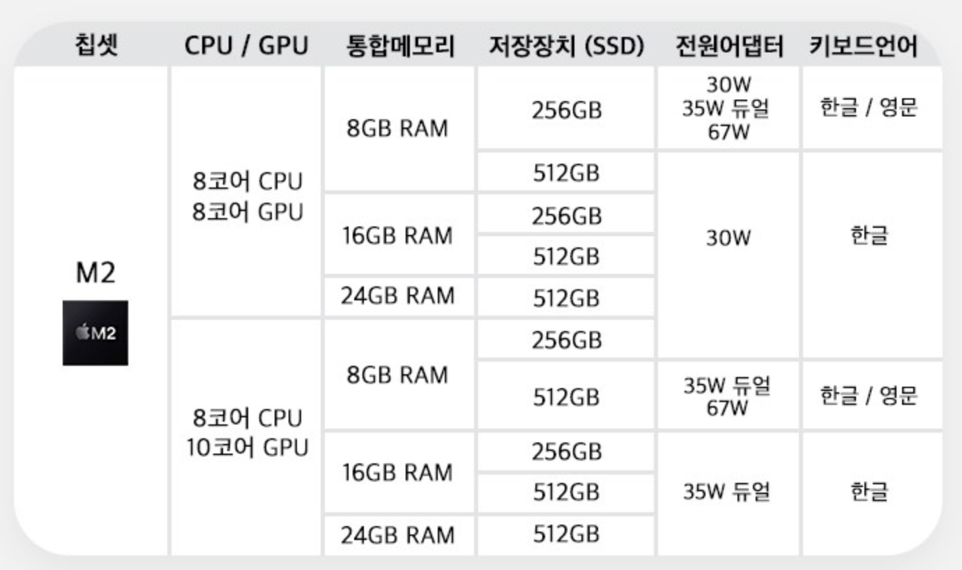 GPU는 크게 상관이 없었기 때문에, M2 8코어 × GPU 8코어 × 512GB × 24GB 옵션으로 주문했다.